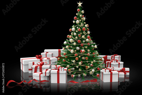 Albero di natale decorato e regali su sfondo nero. - Acquista questa illustrazione stock ed esplora illustrazioni simili in Adobe Stock | Adobe Stock